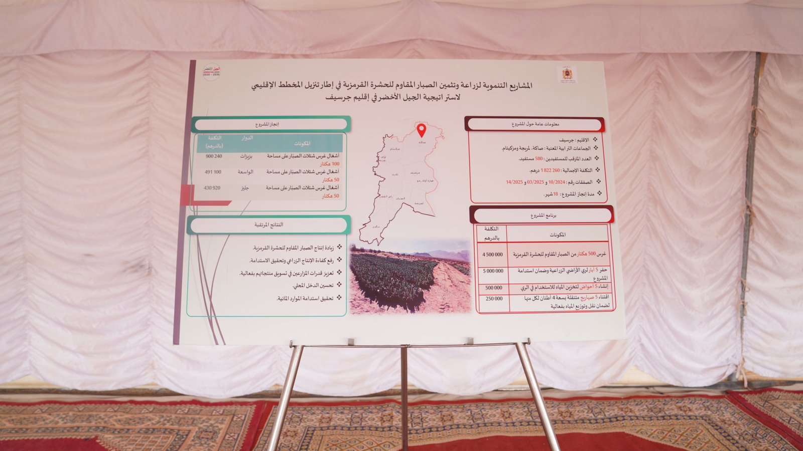 وتبلغ تكلفة هذا المشروع ,00 931,020 درهما، بتمويل كامل من وزارة الفلاحة والصيد البحري والتنمية القروية والمياه والغابات، في إطار برامجها الهادفة إلى تشجيع الفلاحة التضامنية والمحافظة على الموارد الطبيعية.